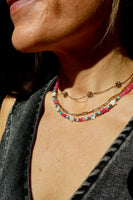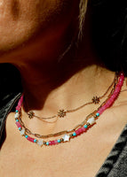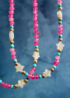 Pink Jade with gold fill & turquoise beads with mother of pearl stars. Adjustable 16"-18"