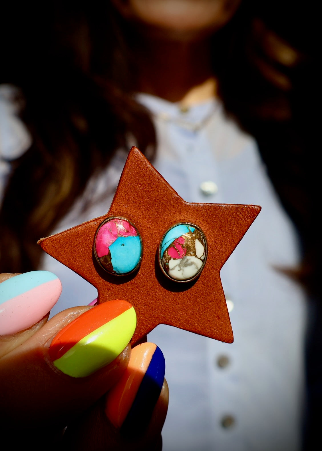 Hot Pink Cotton Candy Turquoise set in Gold Alchemia with Stainless Steel Posts.
