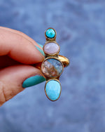 Peruvian Opal, Golden Hills & Blue Ridge turquoise and Chalcedony set in Gold Alchemia. This ring adjusts from size 4-10.