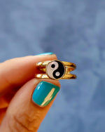 Tiny Mother of Pearl YinYang set in Gold Alchemia. This ring adjusts from size 6-10.