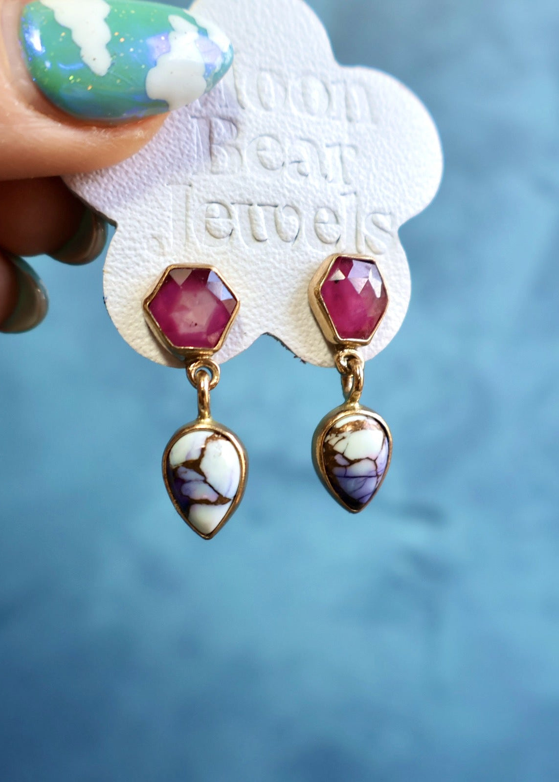 Designed by Moon Bear Jewels amidst the scenic beauty of Telluride, Colorado, these earrings were meticulously crafted using semi-precious stones. Each piece is uniquely crafted. You will receive the exact item photographed. Thank you for supporting our small, woman-owned, queer-owned business!