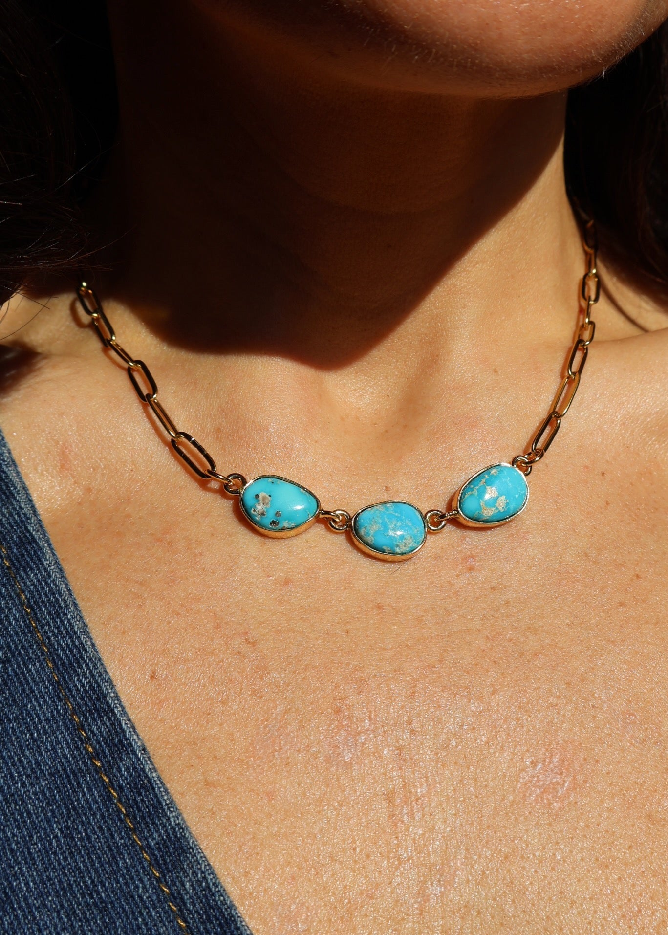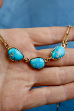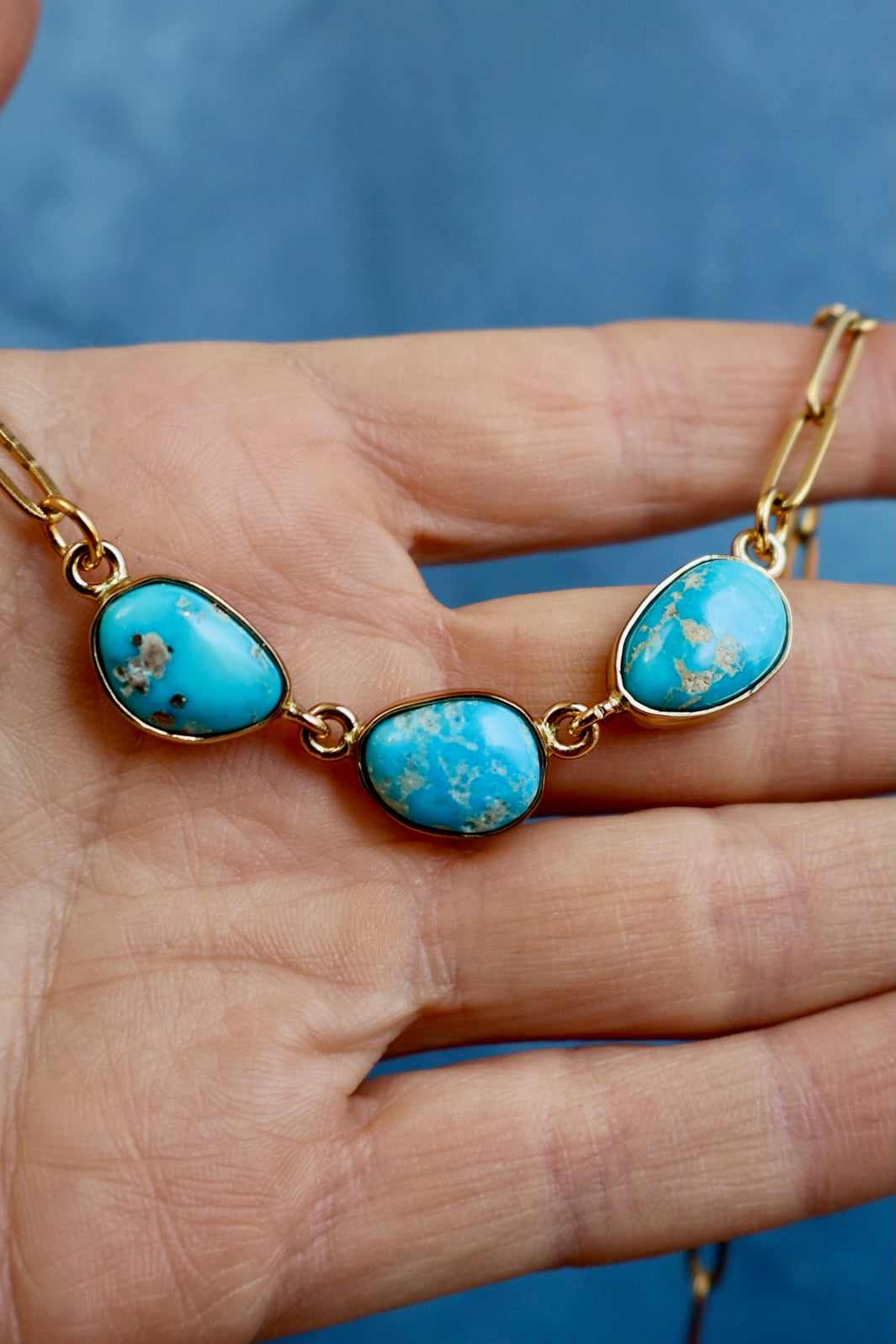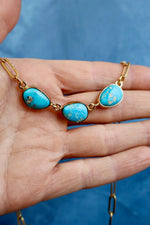 Three Blue Ridge turquoise stones from Nevada — each with its own unique color and matrix — on an 18-inch gold PVD paperclip chain. The triple stone layout gives this necklace that layered look without the effort of actually layering.