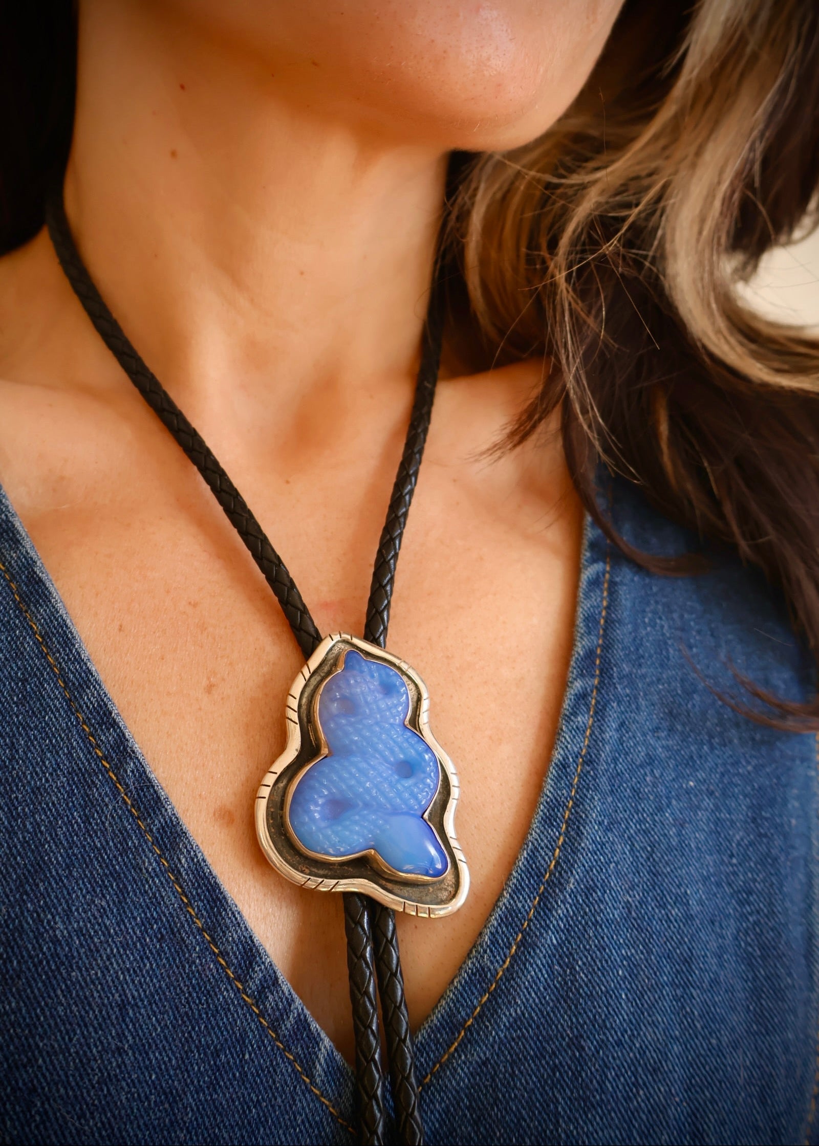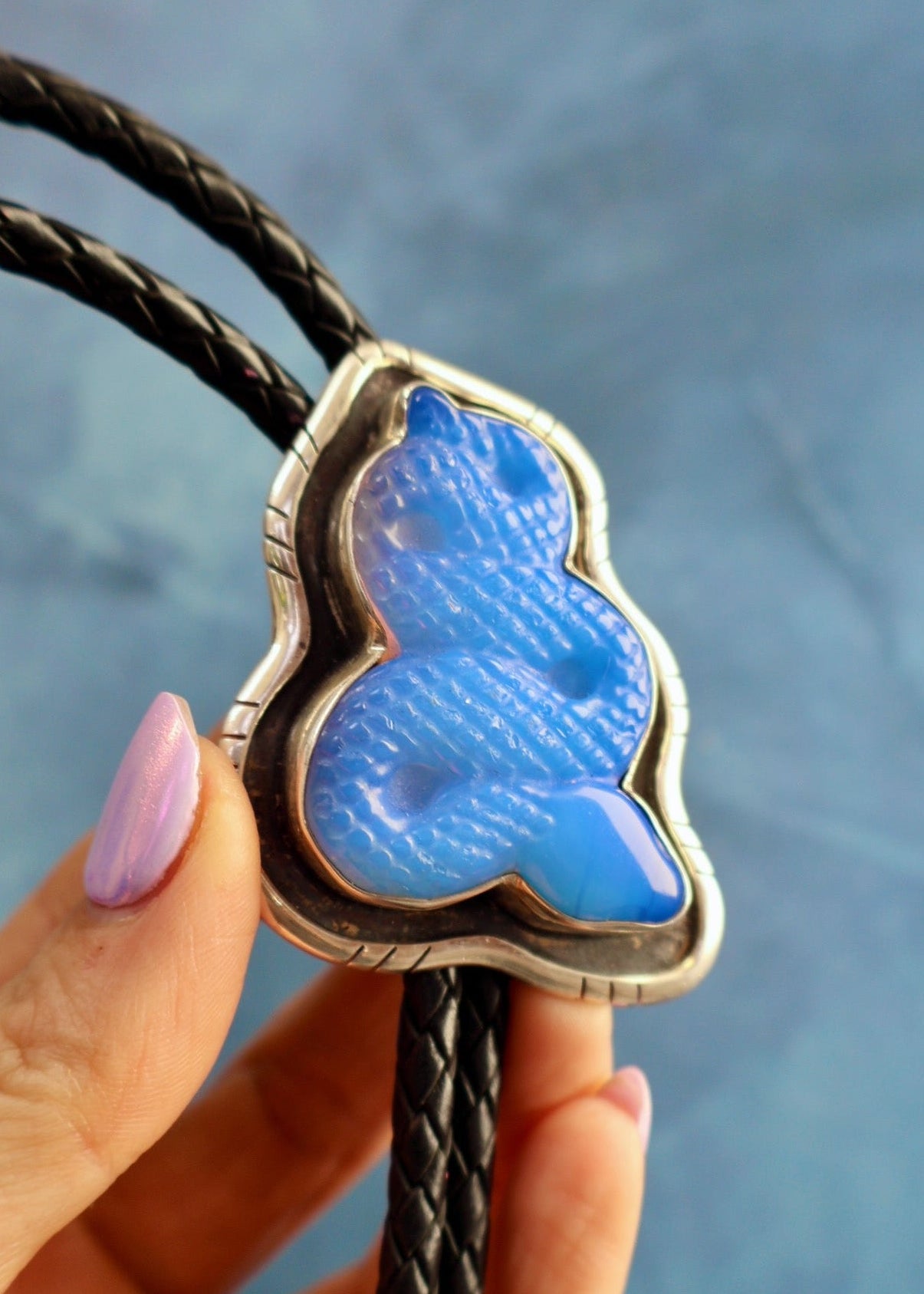 A snake bolo — because sometimes your accessories need a little bite. Opalite set in sterling silver on braided Napa lamb leather with brass tips. The serpent has been a symbol of transformation and rebirth for centuries, and it also just looks really cool.