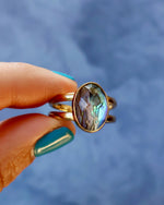 Abalone & Crystal Doublet set in Gold Alchemia. This ring adjusts from size 6-10.