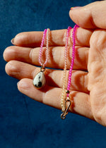 White Buffalo set in Gold Alchemia on hand beaded sparkling pink crystal necklace.