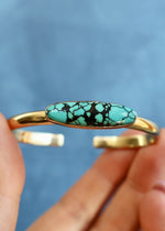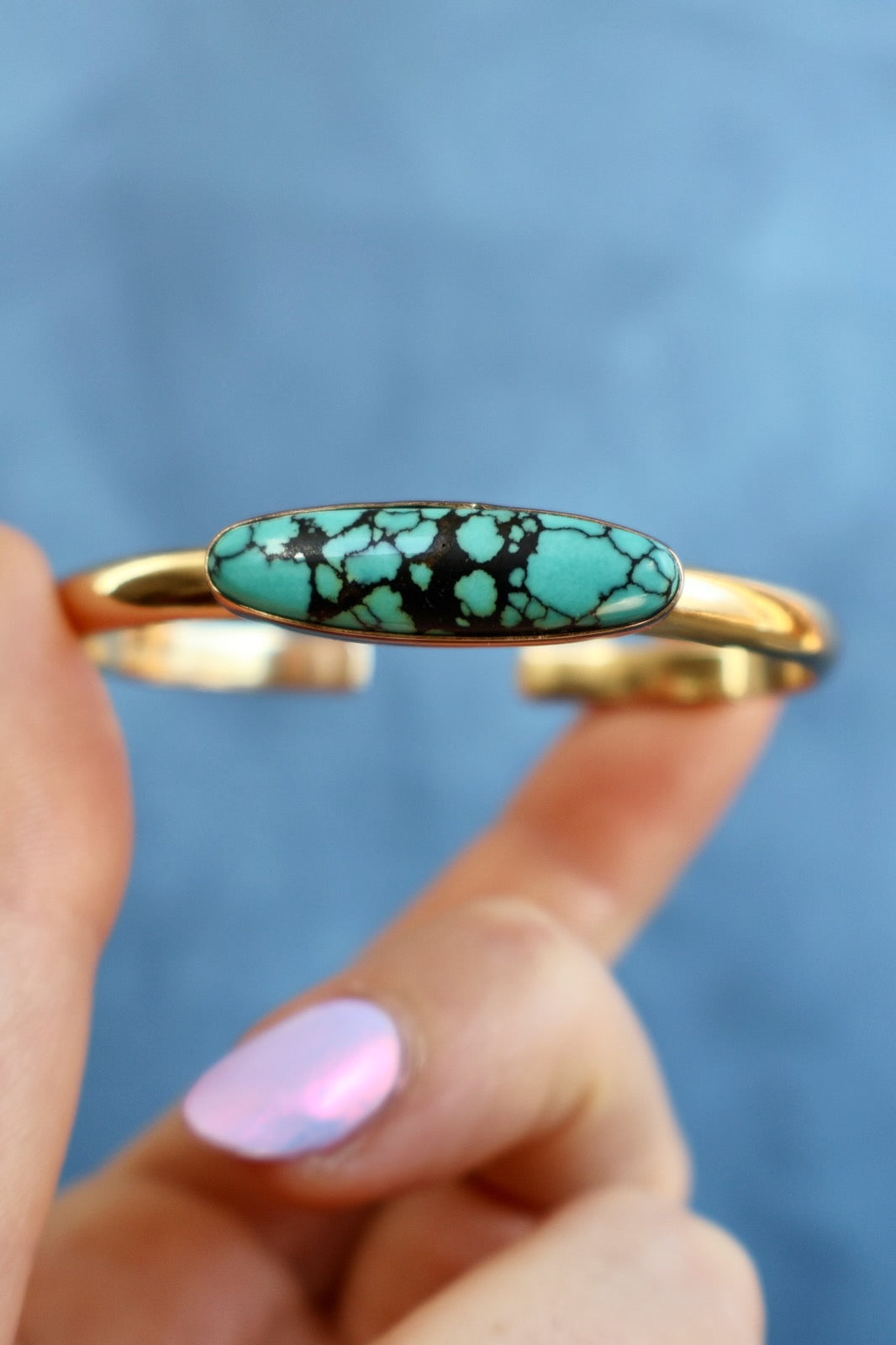 Cloud Mountain turquoise from China is known for its striking blue with dark spiderweb matrix — and it looks gorgeous set in gold alchemia on a cuff bracelet. Rare stone, one-of-a-kind piece.