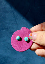Kingman turquoise set in gold alchemia with sterling silver posts.