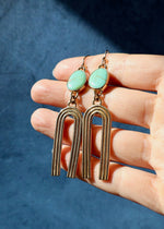 Campitos Turquoise set in Gold Alchemia with Gold Fill Ear Wires. Each earring measures roughly 2.5" long and weighs 6.5 grams.