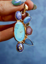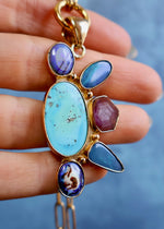 Morenci Turquoise surrounded by opals and ruby in Gold Alchemia. This listing is for the pendant only. You can purchase the accompanying chain here.